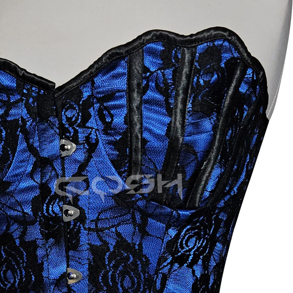 ชุดคอสตูมบูร์เลสก์สีน้ำเงินผ้าซาตินสีดำตาข่ายสไตล์โกธิค คอร์เซ็ทเสริมโครงเหล็กแบบโอเวอร์บัสต์ สำหรับสาวรูปร่างอวบ จำหน่ายโดยผู้ผลิตคอร์เซ็ทแฟชั่น