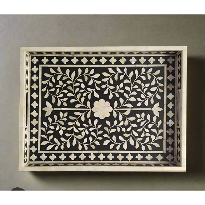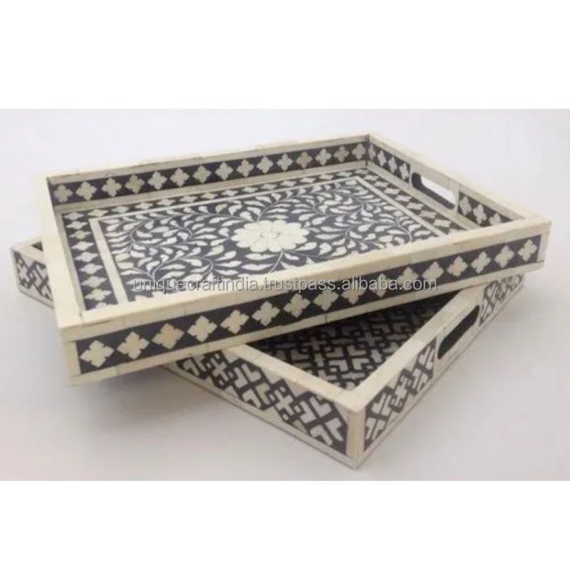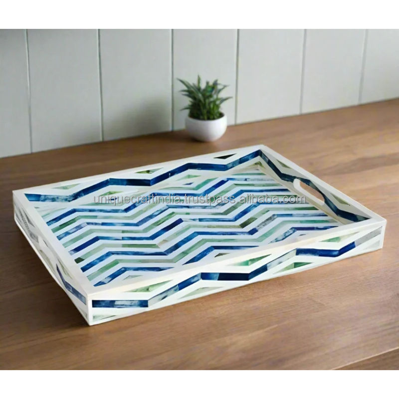 ฐานไม้สไตล์ชายฝั่งทะเลถาดเสิร์ฟทรงสี่เหลี่ยมฝังลายหอยเชลล์สีน้ำเงิน