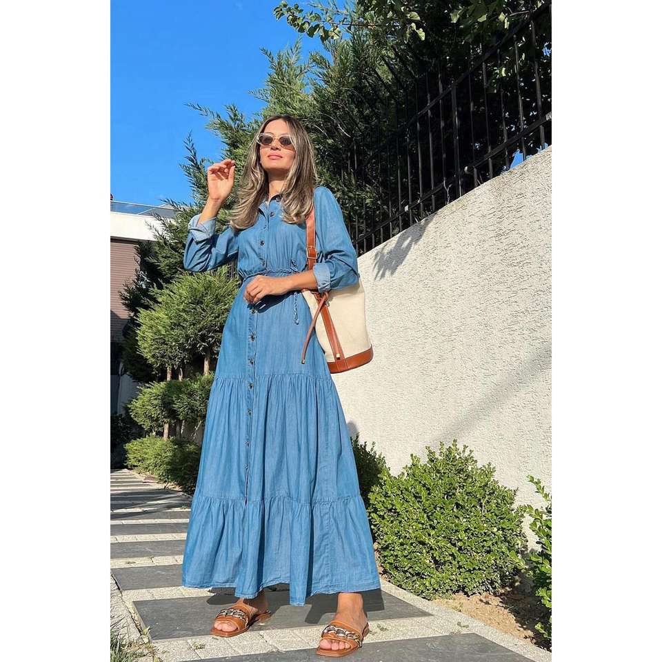 เดรสเชิ้ตสีน้ำเงิน คอปก เอวธรรมชาติ ผ้าทอ ระบายอากาศได้ดี ชุดลำลองใส่ได้ทุกวัน