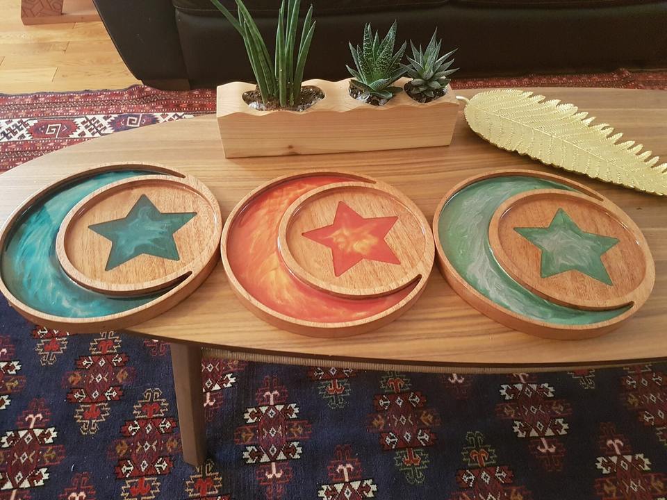 ถาดไม้ลายดาวสีน้ำเงินและพระจันทร์สำหรับเสิร์ฟขนมหวาน ของว่าง อาหารเรียกน้ำย่อย และของตกแต่งโต๊ะในช่วงเทศกาลรอมฎอนและอีด จากอินเดีย