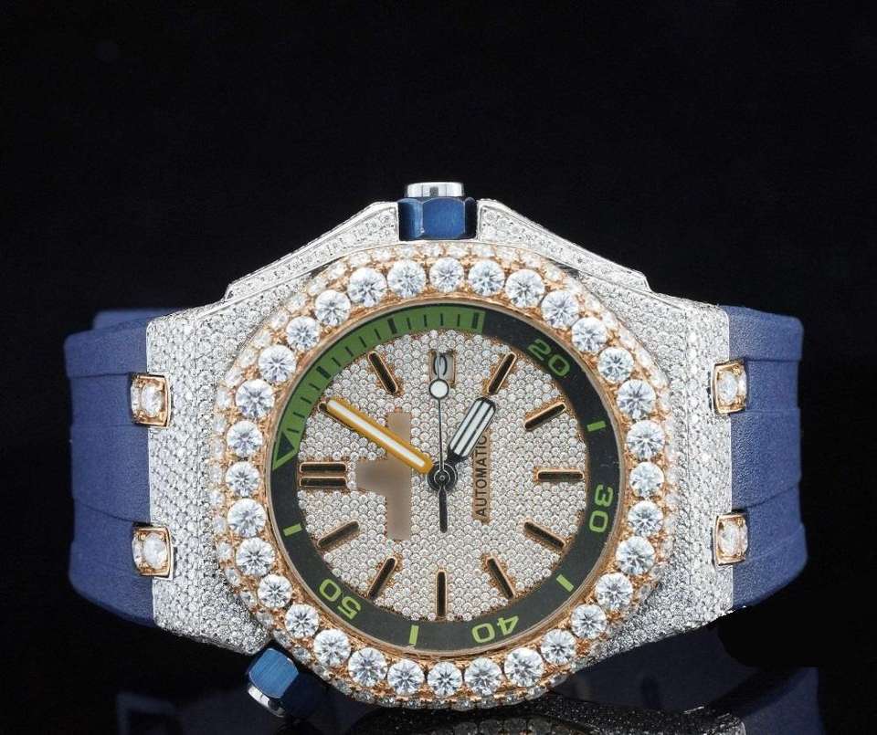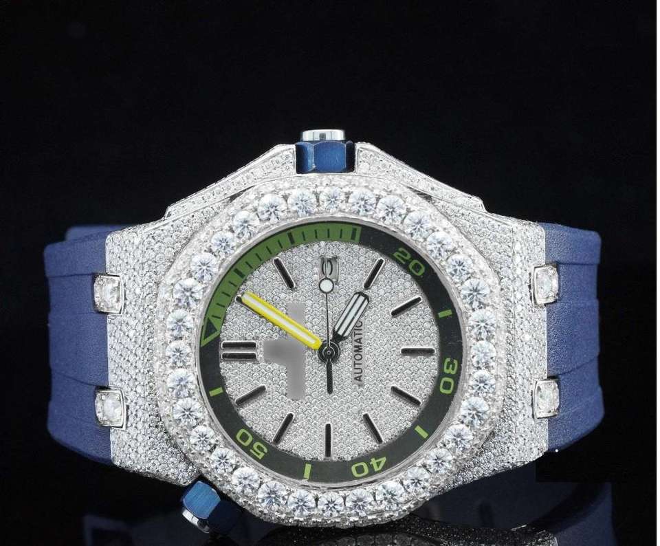 นาฬิกาข้อมือฮิปฮอปสุดหรู รุ่นลิมิเต็ดอิดิชั่น ขนาด 44 มม. สายสีน้ำเงิน ระบบออโตเมติก ประดับเพชรโมอิสซาไนต์