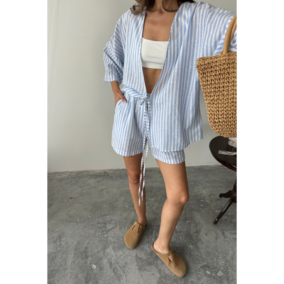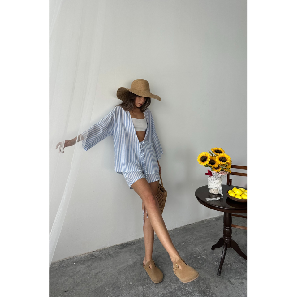 ชุดเสื้อคลุมและกางเกงขาสั้นลายทางสีน้ำเงินชุดลำลองฤดูร้อนของผู้หญิงชุดชายหาดทรงหลวม