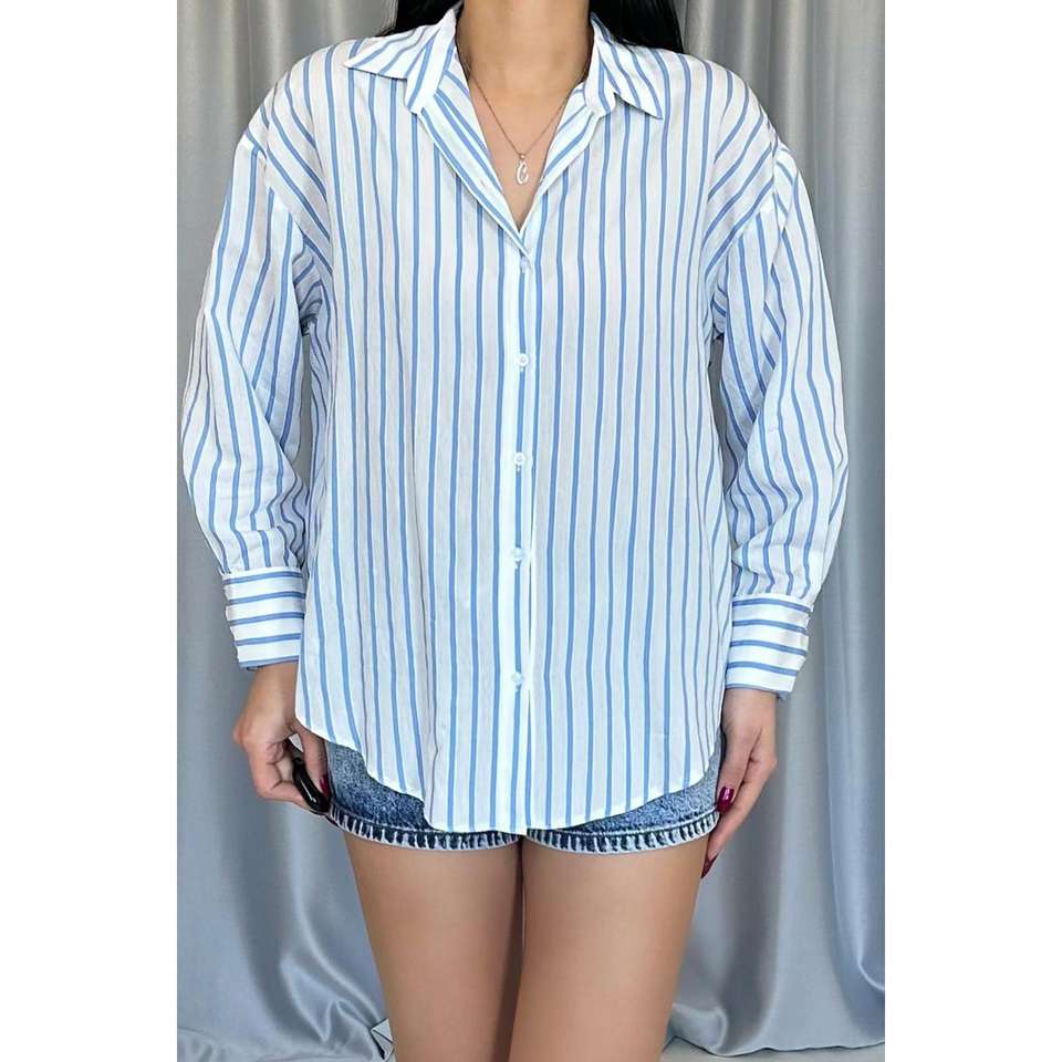 เสื้อเชิ้ตผู้หญิงลายทางสีน้ำเงิน กระดุมหน้า สไตล์ลำลอง ผ้าป๊อปลิน ใส่ได้ทุกวัน ดีไซน์เรียบง่าย แขนยาว