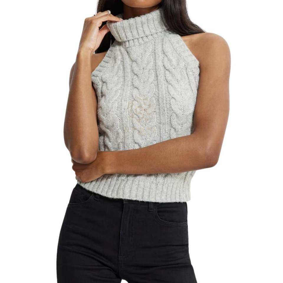 เสื้อถักไหมพรมสีน้ำเงินแบบไม่มีแขน คอกลม ลายกราฟิกนามธรรมสำหรับผู้หญิง เสื้อสเวตเตอร์แบบสวม ไม่มีแขน สั่งทำได้