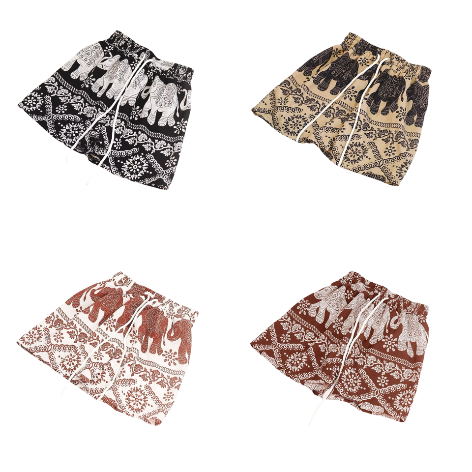 กางเกงขาสั้นลายช้างไทยสีน้ำเงินผ้าไหมอิตาลีเอวยางยืด