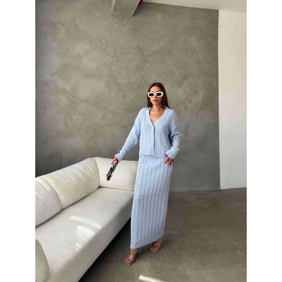 ชุดเสื้อถักนิตติ้งสามชิ้นสีน้ำเงิน ชุดเสื้อสเวตเตอร์ผู้หญิง ไซส์ S เสื้อแขนยาวถักลายเคเบิ้ลและกระโปรง ชุดลำลองแสนสบาย