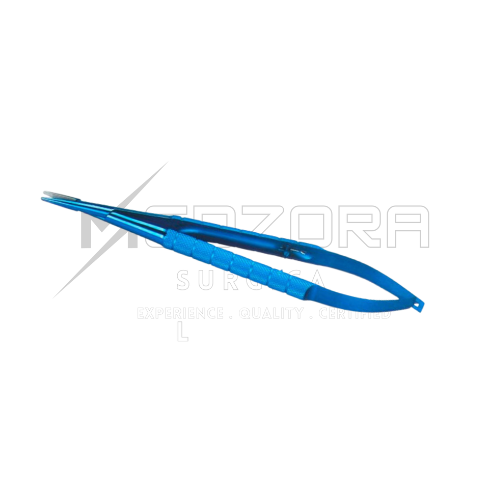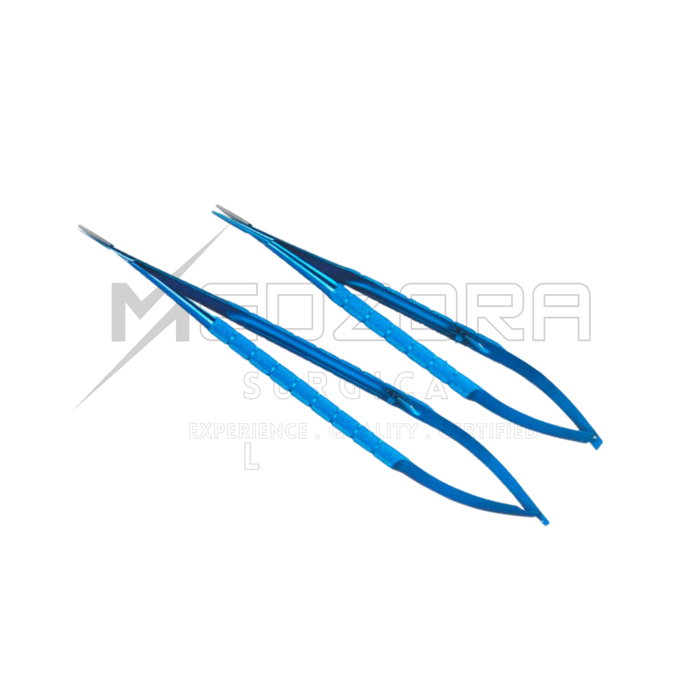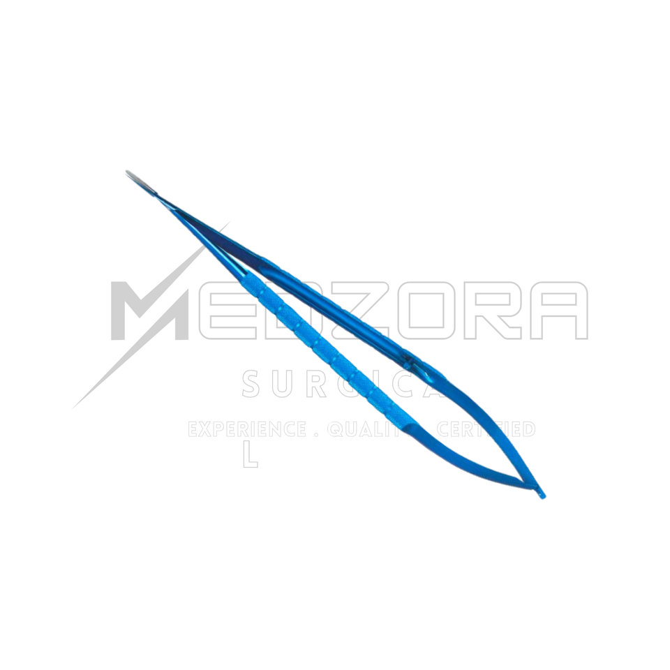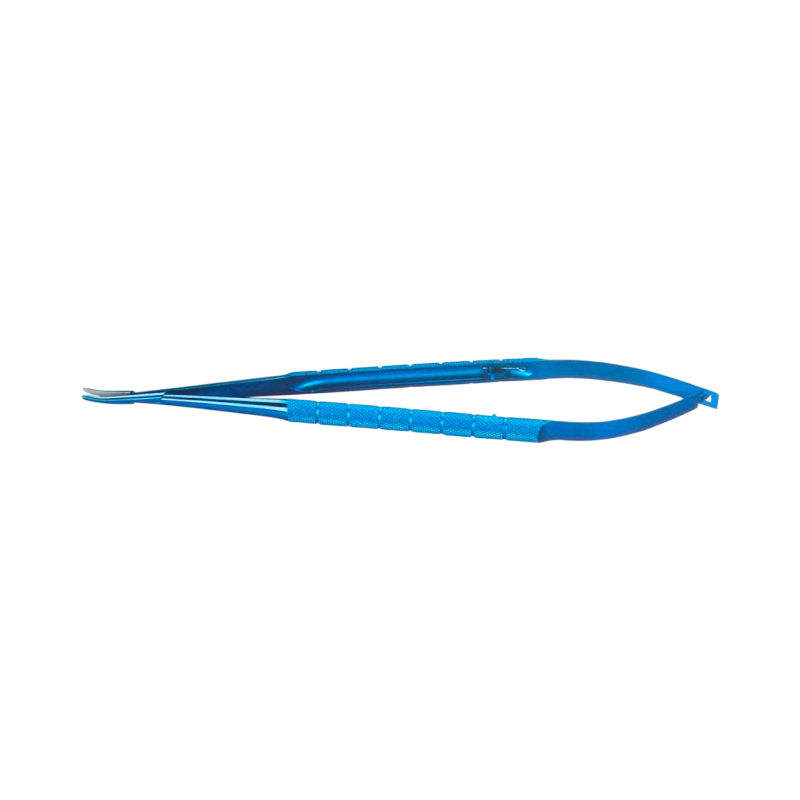 กรรไกรผ่าตัดขนาดเล็กแบบแมนนวล สีฟ้าไทเทเนียม ด้ามจับสปริง ปลายโค้ง เครื่องมือจักษุแพทย์ ได้รับการรับรองมาตรฐาน CE สำหรับดวงตา