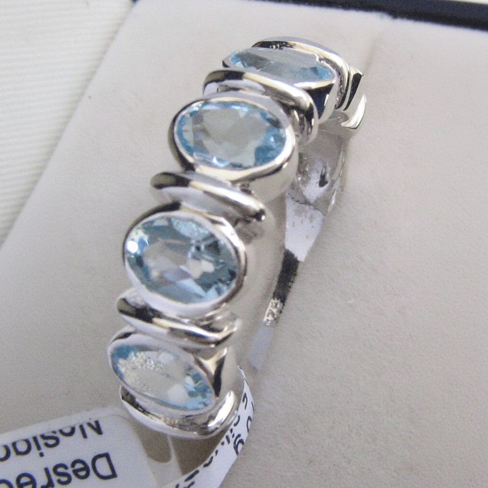 แหวนบลูโทแพซทรงเรขาคณิตแบบโบโฮ ประดับโอปอลทรงรีเจียระไนแบบมรกต หินธรรมชาติ ดีไซน์เรียบหรู เงินสเตอร์ลิงชุบโรเดียม น้ำหนักรวม 5.55 กรัม