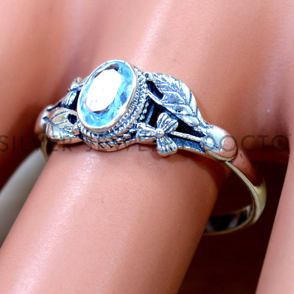 แหวนพลอยบลูโทแพซทรงเหลี่ยมเงินแท้ 925 แหวนเงินทำมือลายดอกไม้และใบไม้ ราคาขายส่งเครื่องประดับ