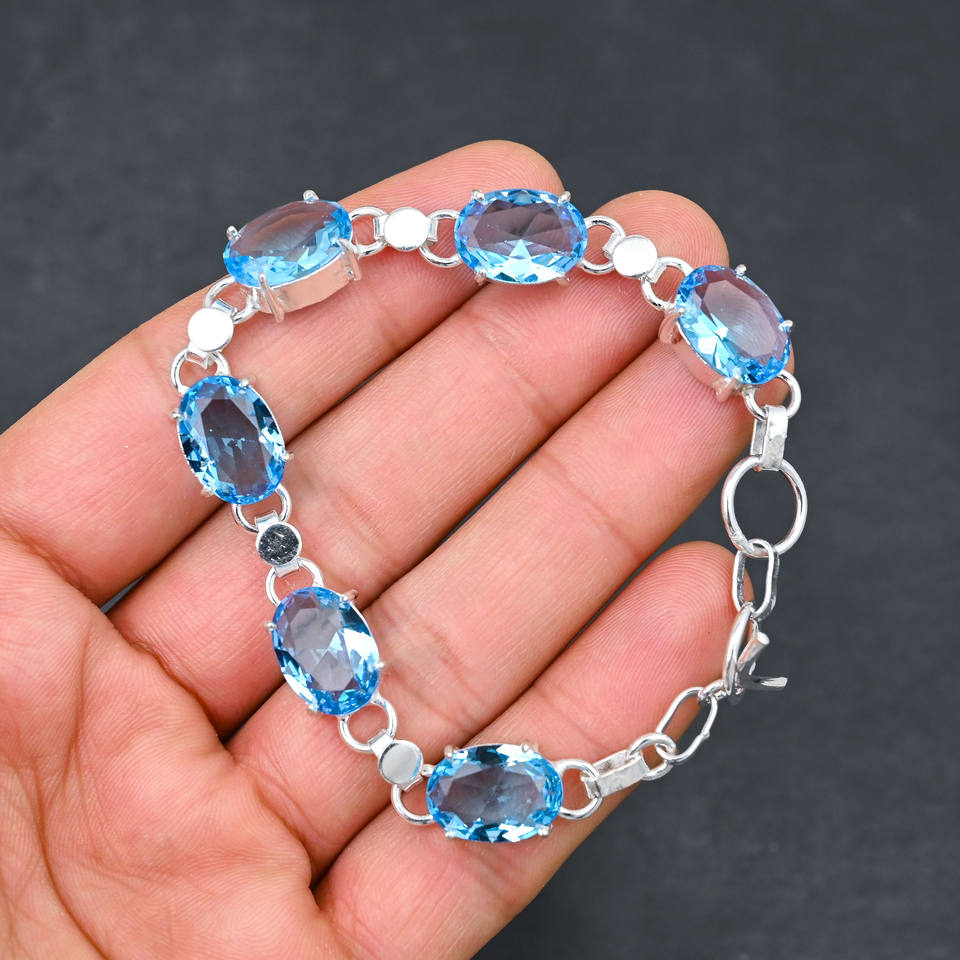 กำไลบลูโทปาซสังเคราะห์ทรงรี 10x14 มม. 5 เม็ด เงินแท้ ปรับขนาดได้ 7-8 นิ้ว รับรองโดย IGI สำหรับทุกเพศ ทันสมัย