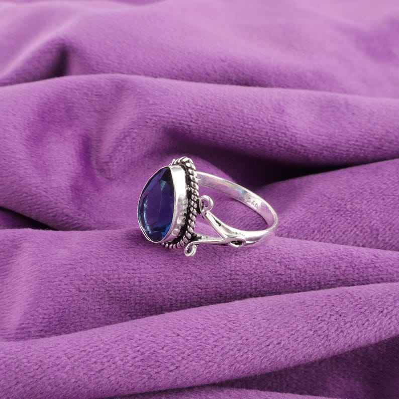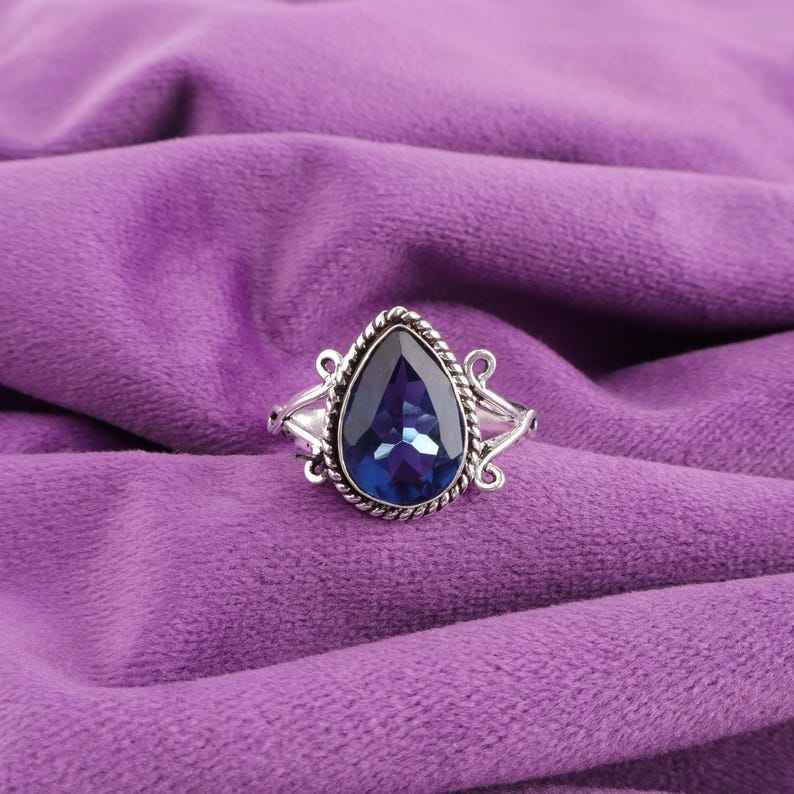 แหวนบุษราคัมสีฟ้า925เงินสเตอร์ลิงทำด้วยมือรูปทรงลูกแพร์ชุบโรเดียมที่น่าตื่นตาตื่นใจสำหรับงานวันเกิดเงิน