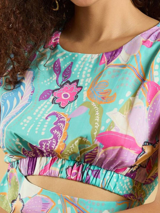 เดรสทรงเอไลน์สีฟ้าพิมพ์ลายดอกไม้เขตร้อน ผ้าระบายอากาศได้ดี รีดง่าย ซักได้ ทรงมิดิ แขนกุด ชายกระโปรงบาน เอวเข้ารูป