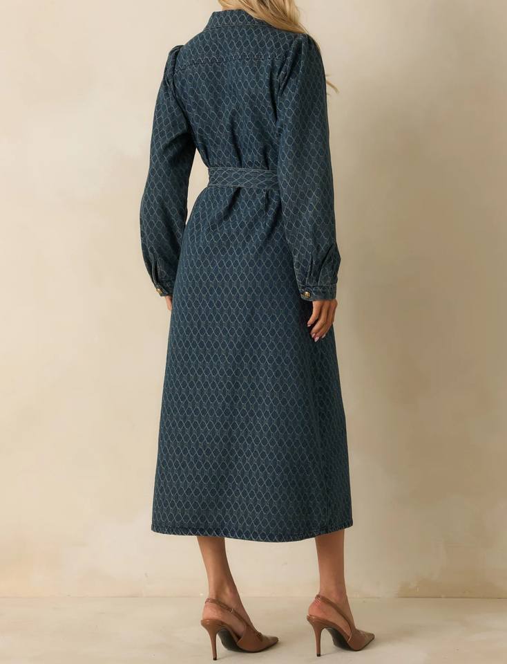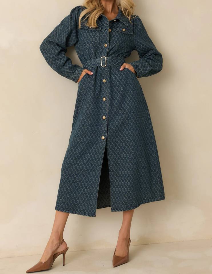เดรสยาวผ้าเดนิมสีน้ำเงินสไตล์วินเทจลำลอง ผ้าโมดอลผสมคอตตอน ติดกระดุมเต็มตัว ทรงเอวธรรมชาติ ประดับคริสตัล