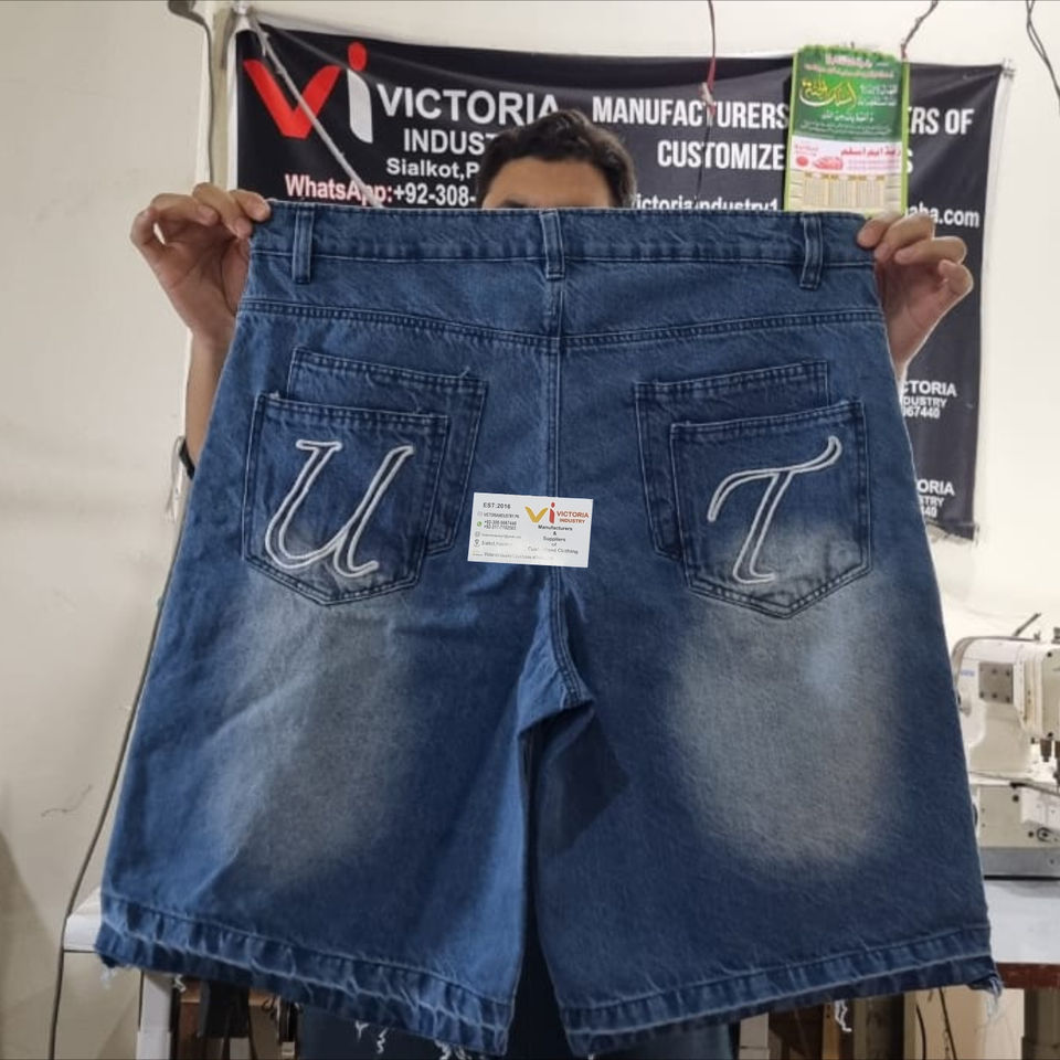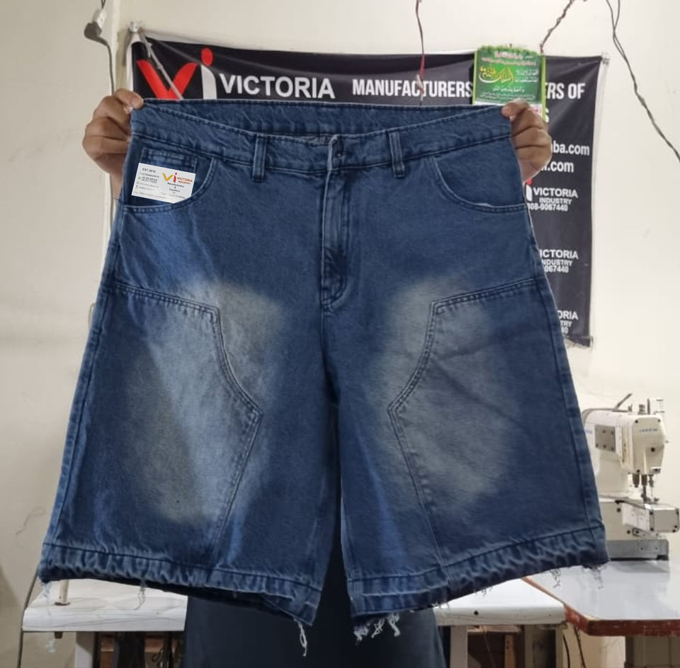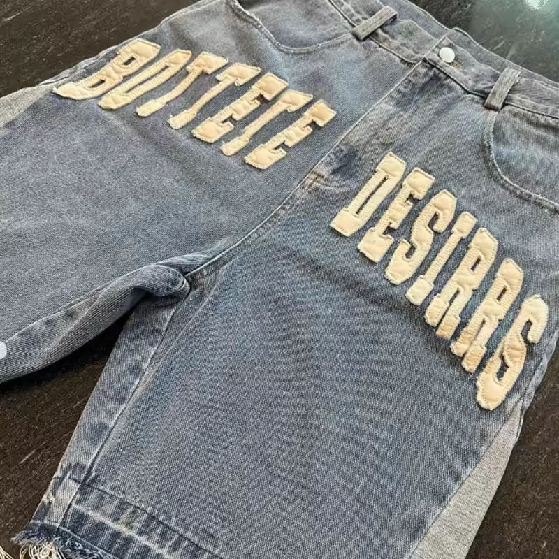 กางเกงยีนส์ขาสั้นสำหรับผู้ชายผ้าเดนิมสีฟ้าซีดแบบแผ่นหินสำหรับทุกเพศ