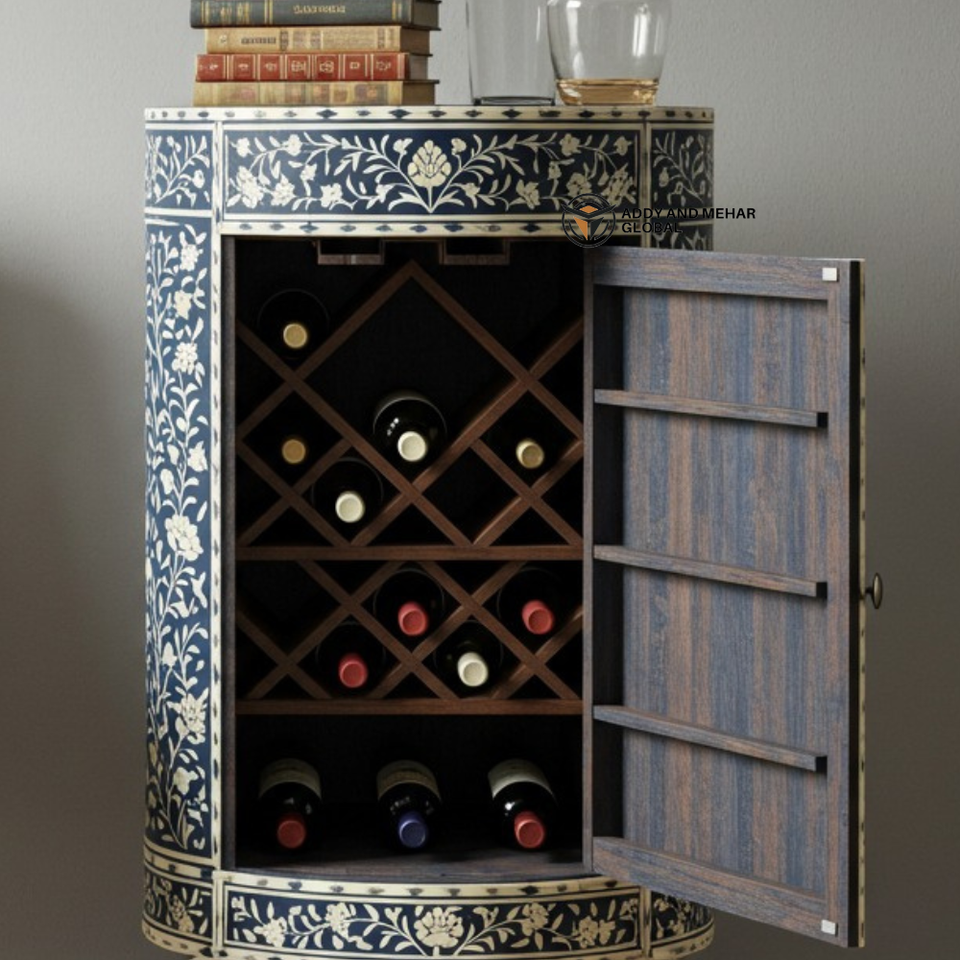 ตู้บาร์ทรงกลมสไตล์โมเดิร์นสีน้ำเงินและสีขาว ประดับด้วยงานฝังกระดูก สำหรับโรงแรมเชิงพาณิชย์ พร้อมชั้นวางไวน์