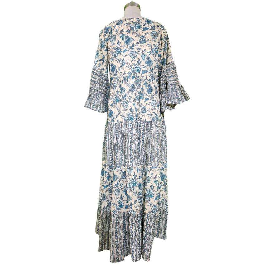ชุด Maxi ผ้าฝ้ายพิมพ์ลายดอกไม้สีฟ้าสีขาวชุดเดรสยาวสไตล์โบฮีเมียนแขนกระดิ่ง