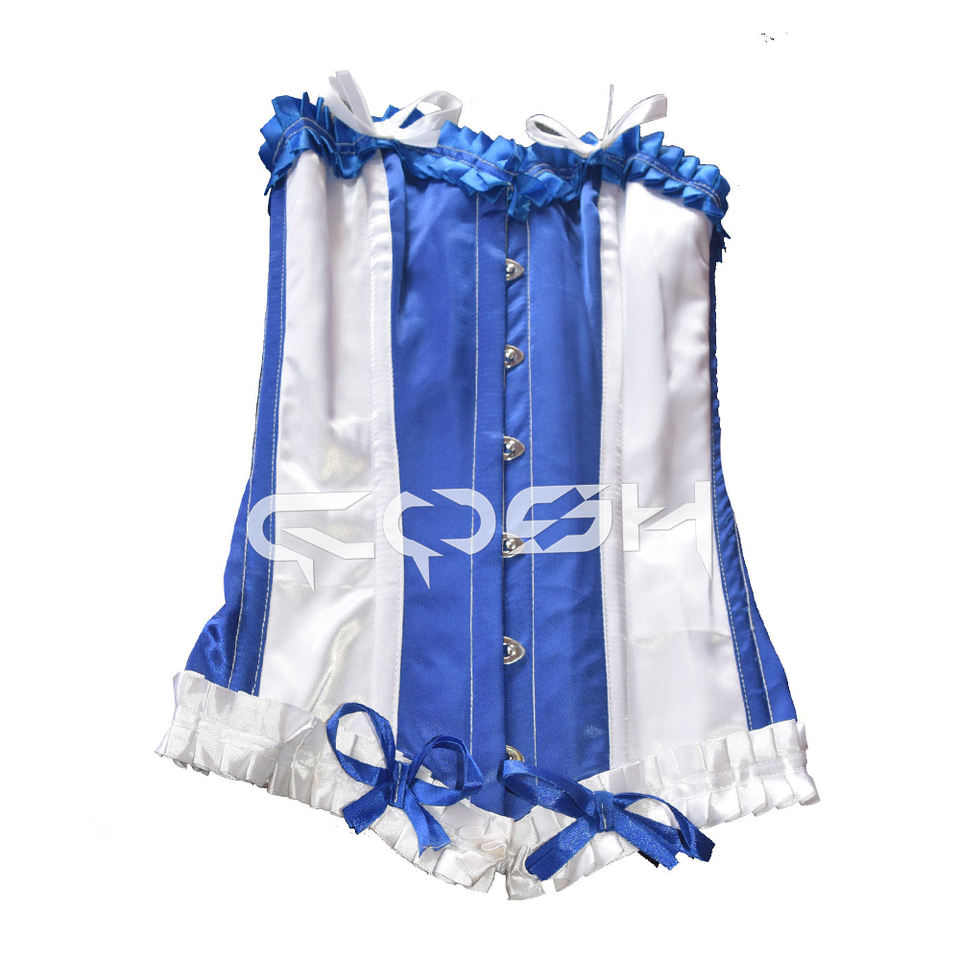 เสื้อคอร์เซ็ททรงโอเวอร์บัสต์สีน้ำเงินขาว ผ้าซาติน โครงเหล็ก แต่งระบายและโบว์