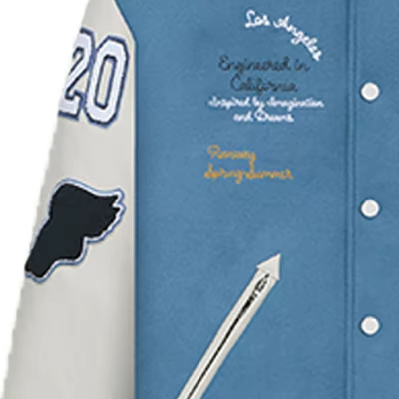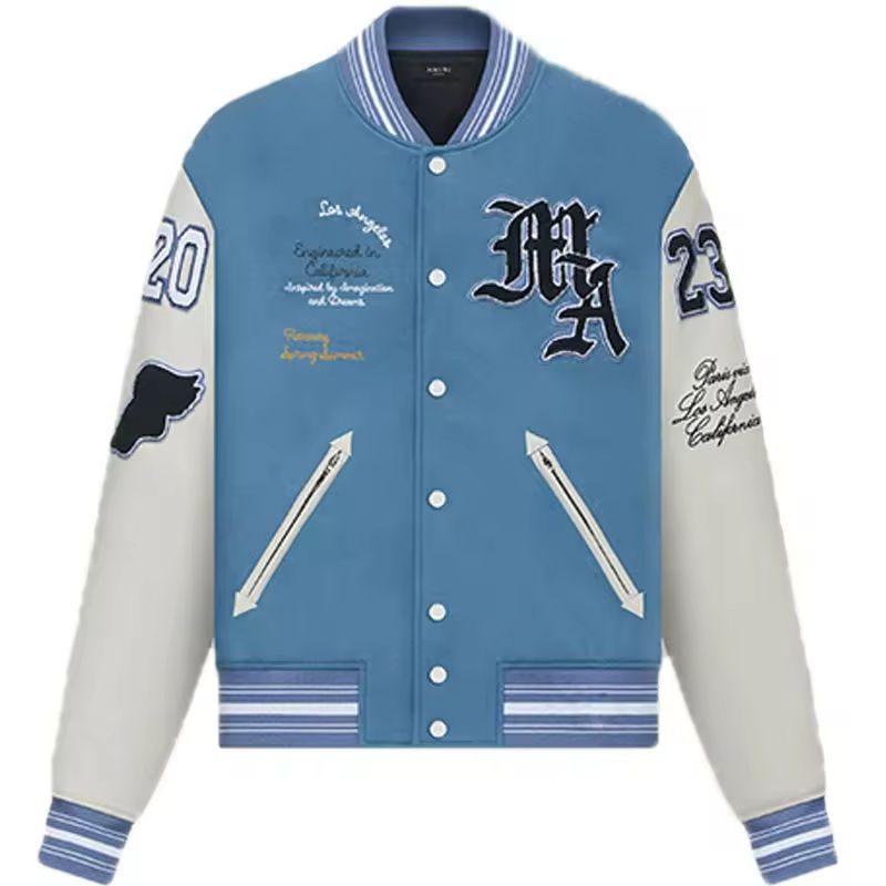 เสื้อแจ็คเก็ตเบสบอลทรง Letterman สีน้ำเงินผ้าวูล แขนหนังสีขาว ปักอักษรด้วยผ้าเชนิลล์ สไตล์ High Street Bomber แฟชั่นขายส่ง