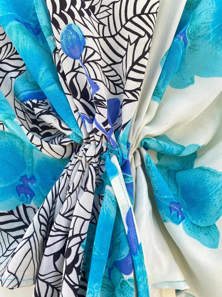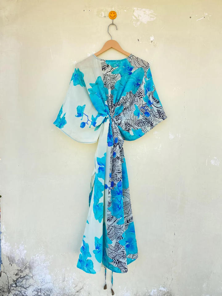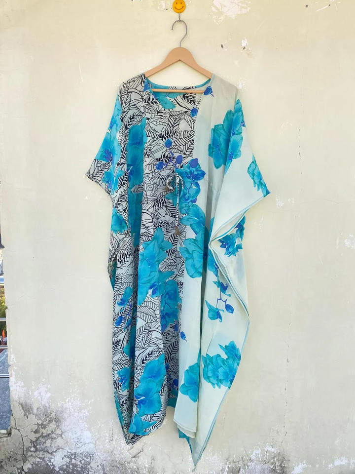ชุดคาฟตันผ้าไหมอินเดียสีน้ำเงินขาวสไตล์วินเทจ ทำมือ 100% ผ้าไหม แห้งเร็ว เหมาะสำหรับใส่ไปชายหาด ชีวิตประจำวัน คุณภาพสูงสำหรับผู้หญิง ฟรีไซส์ สำหรับฤดูร้อน