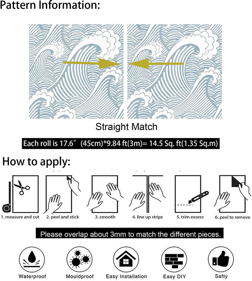 วอลล์เปเปอร์ติดผนังสีฟ้าและสีขาวมีกาวในตัวลอกและติดสติ๊กเกอร์ตกแต่งที่ถอดออกได้สำหรับตกแต่งบ้าน