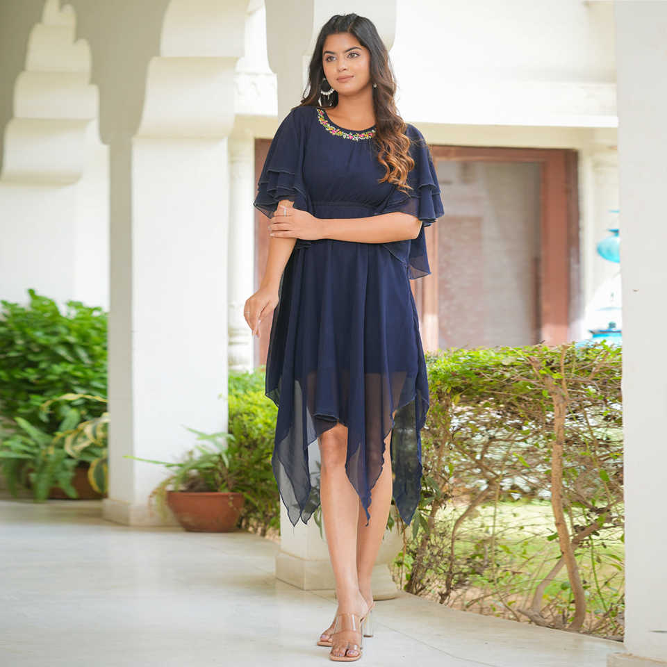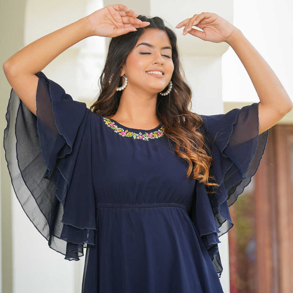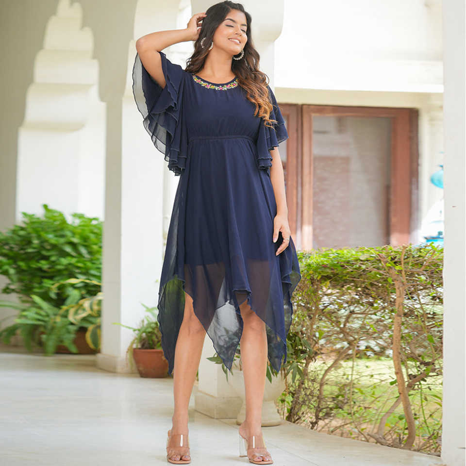 เดรสผ้าจอร์เจตต์สีน้ำเงินแบบไม่สมมาตรสำหรับผู้หญิง พร้อมลายปักดอกไม้และแขนเสื้อแบบซ้อนชั้น ดีไซน์คอทรงกลม ให้ลุคสบายๆ