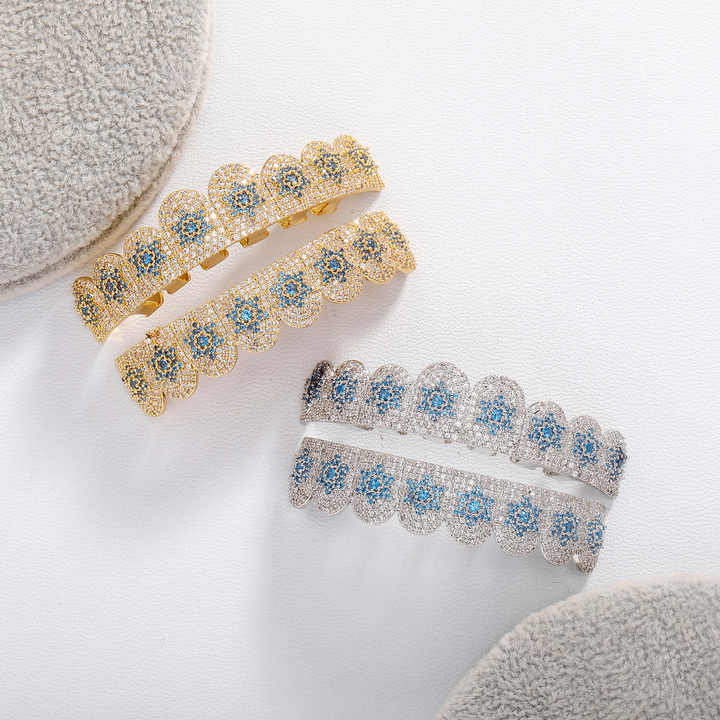 ชุดตะแกรงฟันฮิปฮอปเย็นบลูส์ลดกระหน่ำสีน้ำเงินประดับเพชร CZ Star อินเทรนด์ตะแกรงฟันผู้ชาย