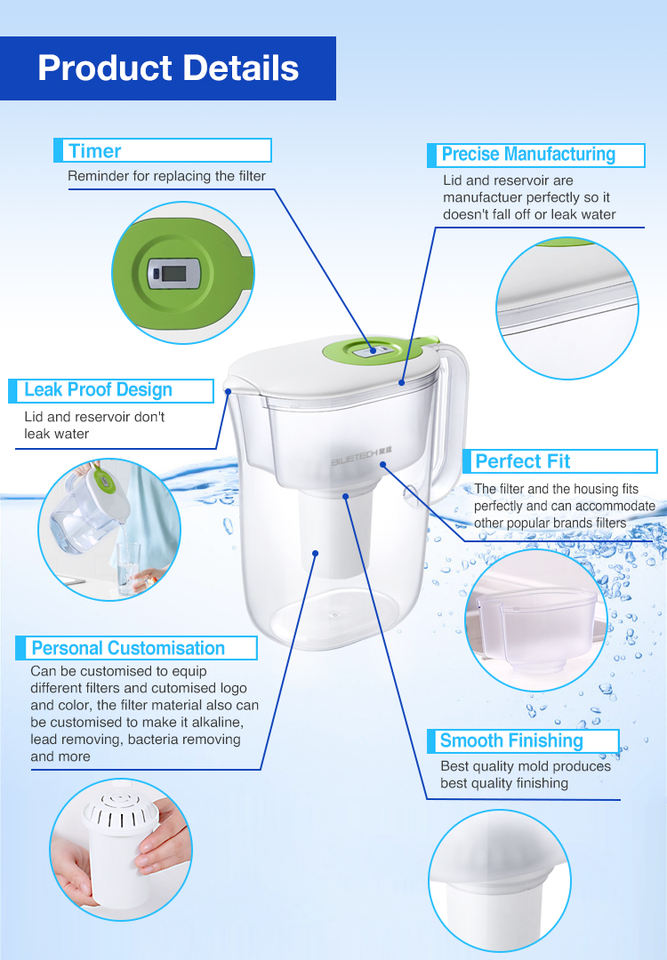 Bluetech ตัวกรองน้ำแบบใช้มือทำจากพลาสติกเหยือกน้ำอัลคาไลน์แบคทีเรียเครื่องกำจัดคลอรีนความจุ3.5L เป็นมิตรกับสิ่งแวดล้อมจากจีน