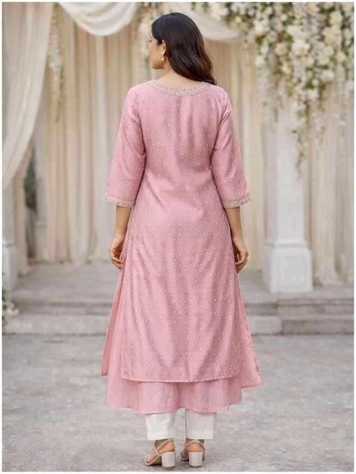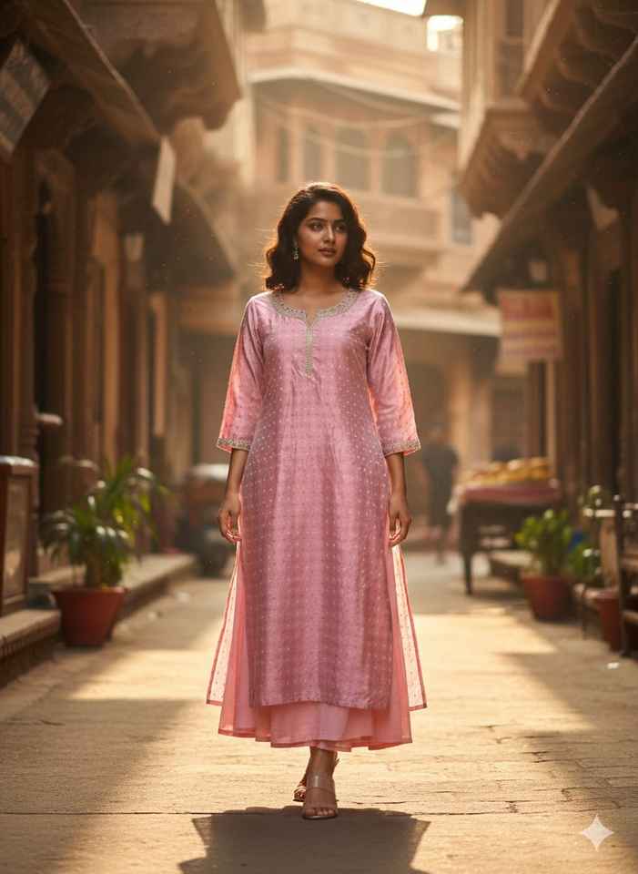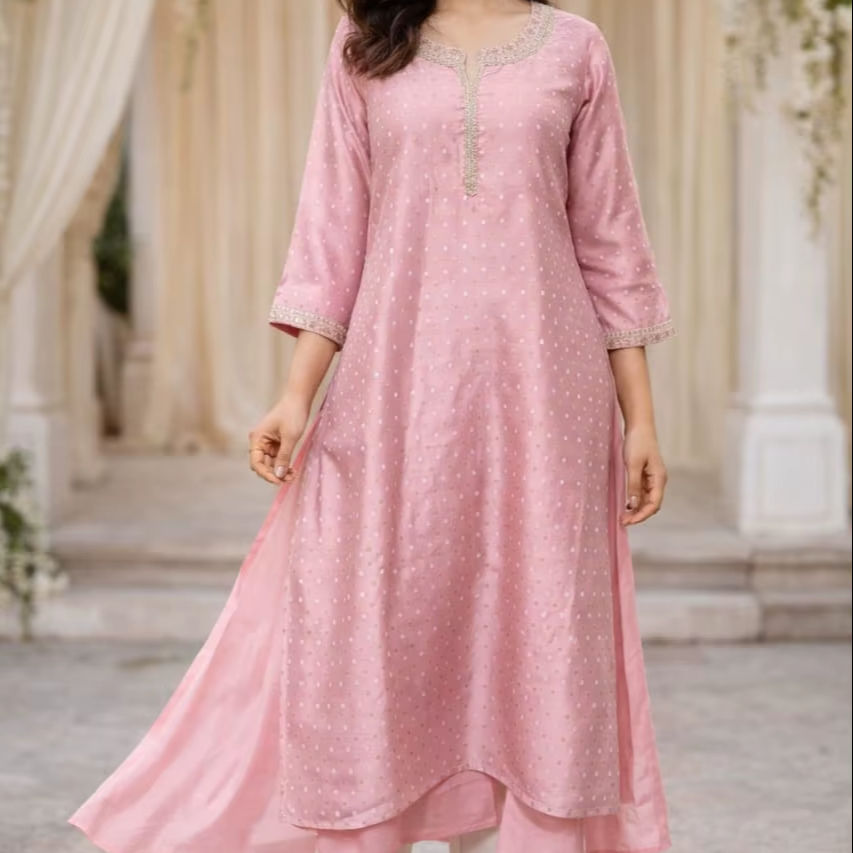 ชุดคุर्ตาผ้าซาติน/ผ้าฝ้ายปักลายสีชมพูอ่อนน่ารัก ซักได้ พร้อมกางเกงขายาวทรงตรงและแขนเสื้อสามส่วนแบบแร็กแลน