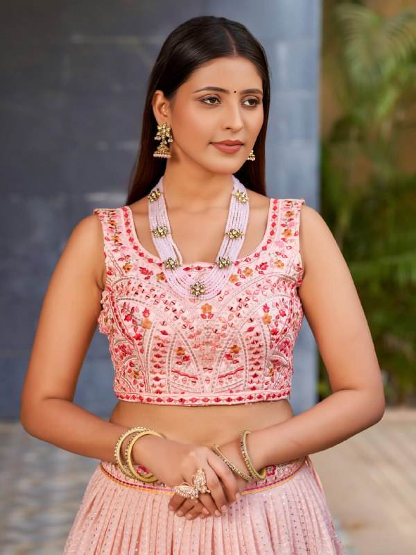 ชุดเลเฮนกาสีชมพูอ่อนผ้าโพลีเอสเตอร์สุดหรู พร้อมกระโปรงผ้าจอร์เจตต์ปักเลื่อม เสื้อผ้าไหม และผ้าคลุมไหล่เนื้อนุ่มสำหรับงานปาร์ตี้