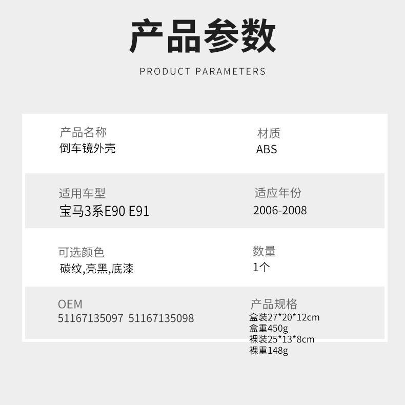 ฝาครอบกระจกมองหลัง BMW ซีรีส์ 3 E90 E91 สีดำ ABS ปี 2006-2008 อะไหล่ทดแทน