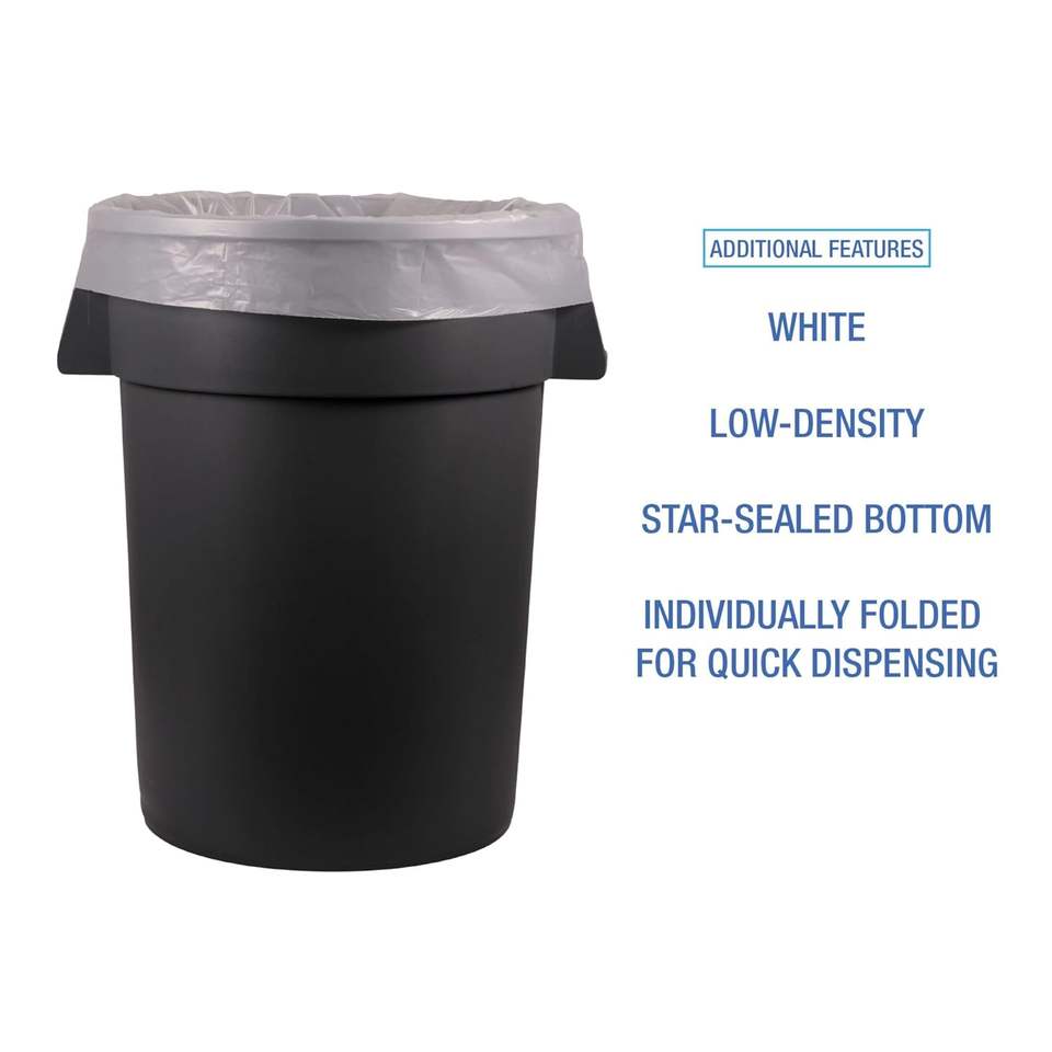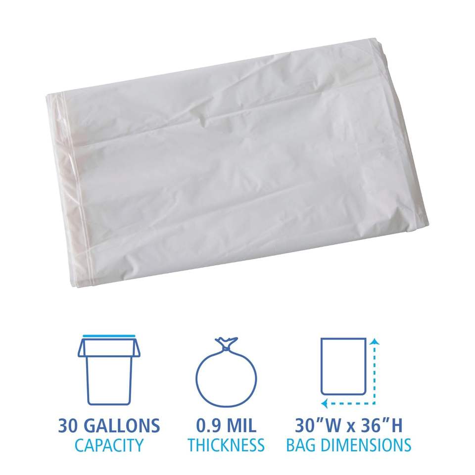 ถุงขยะอุตสาหกรรมสีขาวขนาด 30 แกลลอน ยี่ห้อ Boardwalk ความหนา 0.9 มิล ขนาด 30 x 36 นิ้ว บรรจุ 100 ใบ/กล่อง ความหนาแน่นต่ำแบบ Linear สำหรับถุงขยะในครัวเรือน