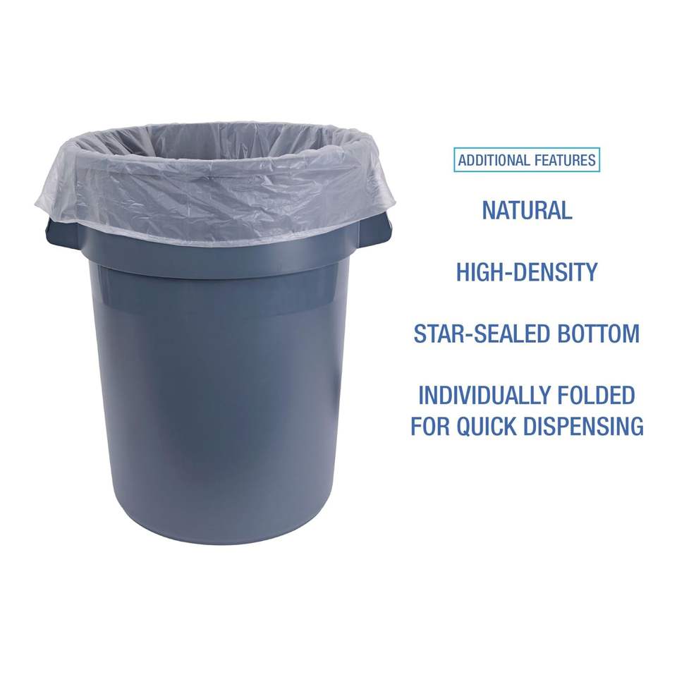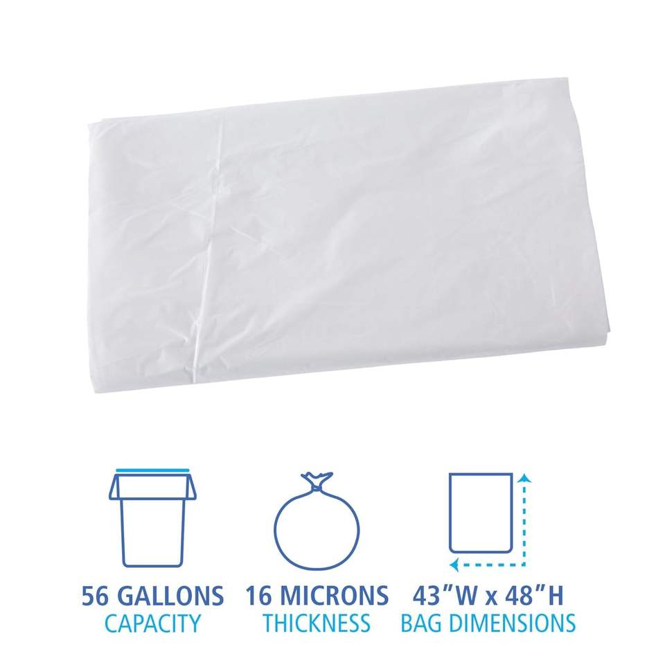 ถุงขยะอุตสาหกรรมแบบแพ็คแบน ขนาด 43 นิ้ว x 48 นิ้ว ความจุ 56 แกลลอน ความหนาแน่นสูง สีธรรมชาติ บรรจุ 200 กล่อง