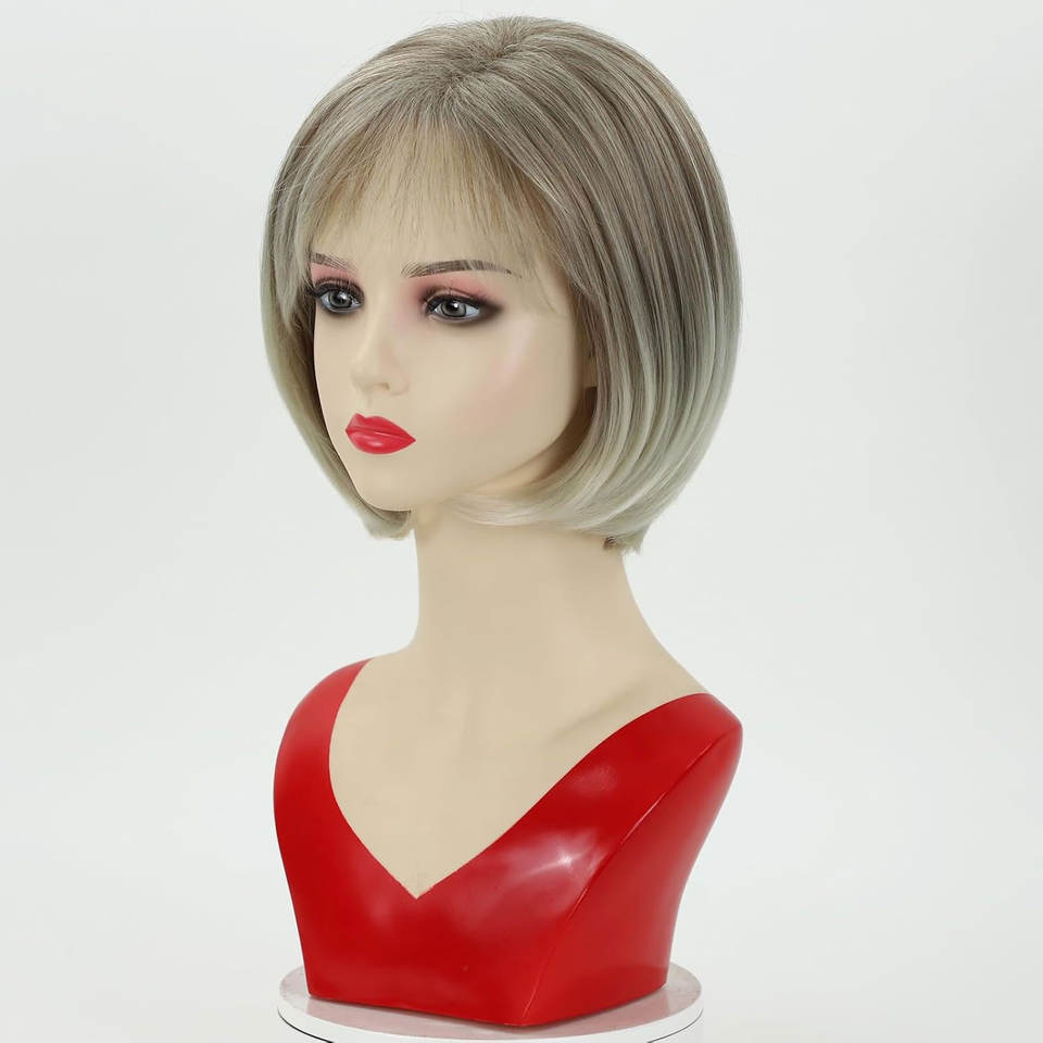 วิกผมบ๊อบสำหรับผู้หญิงสีน้ำตาลผสมสีบลอนด์ผมหน้าม้า10นิ้วดูเป็นธรรมชาติปาร์ตี้ทุกวันสีบลอนด์ทนความร้อน