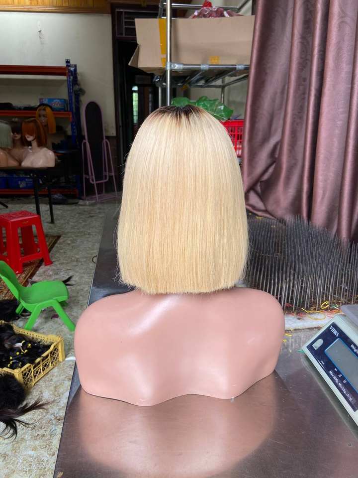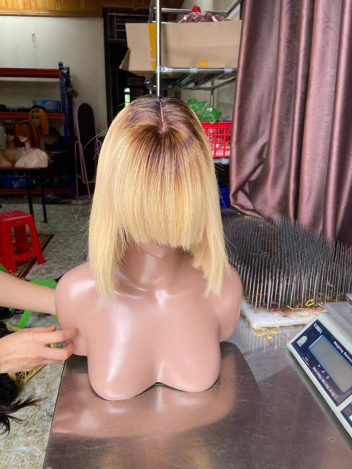 วิกผมบ๊อบแบบปิดวิกผมดิบแบบเวียดนามผมตรงสีบลอนด์ผมมนุษย์ลูกไม้โปร่งใสมีวิกผมหน้าม้าสำหรับผู้หญิงผิวดำ