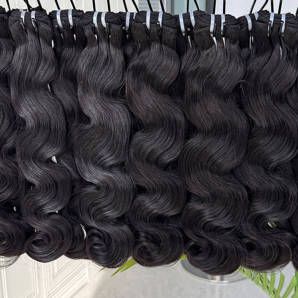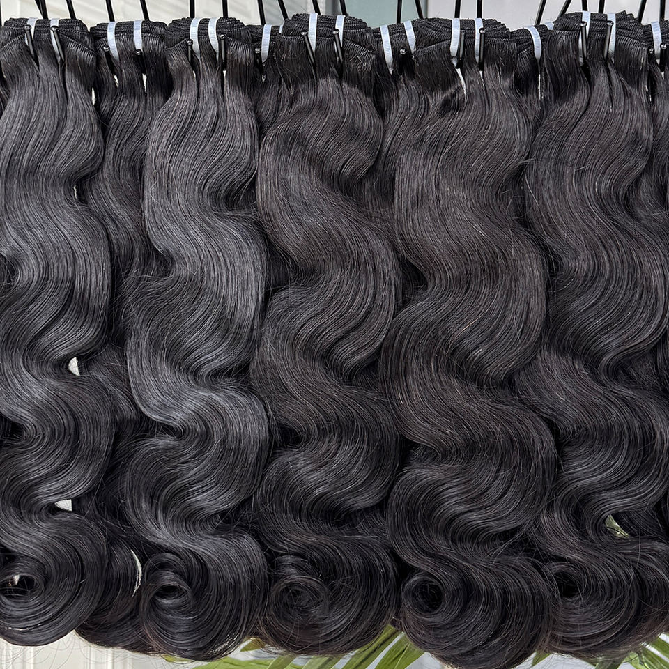 ผมต่อแบบ Body Wave แท้ สีดำธรรมชาติ นุ่มสลวย เป็นลอน หนาแน่น สองชั้น เหมาะสำหรับร้านเสริมสวยและผู้ค้าส่ง