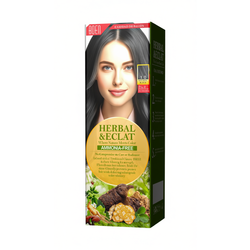 โบเอน เฮอร์เบิล แอนด์ เอคลัต ยาย้อมผมถาวร สีดำ 1.0 ปราศจากแอมโมเนีย สำหรับทุกสภาพเส้นผม สูตรน้ำเกรดพรีเมียม