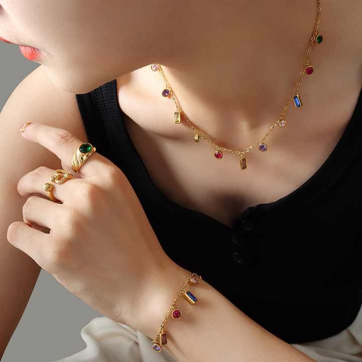 สร้อยคอโบฮีเมียเคลือบทองป้องกันการหมอง 18K สร้อยคอเหล็กกล้าไร้สนิมแท้ประดับเพชรหลากสีสำหรับผู้หญิงและเด็กผู้หญิง