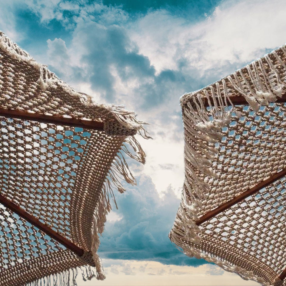 ร่มชายหาดโบฮีเมียนคลาสสิก ทำจากเชือกฝ้ายถักแบบมาคราเม่ พร้อมเสาไม้ พู่ห้อยทำมือ และผ้าคลุมทอประดับชายครุย