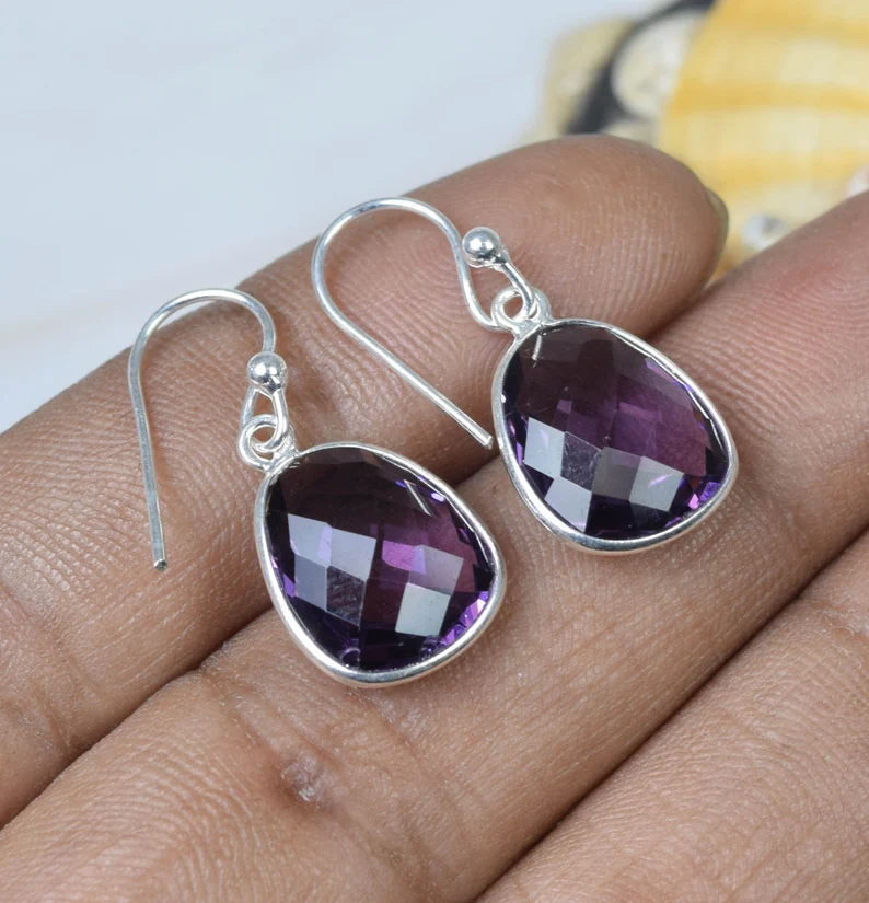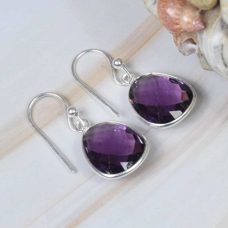 925โบฮีเมียนสเตอร์ลิงเงินแฮนด์เมดอเมทิสต์ควอทซ์อัญมณีต่างหูตะขอเกี่ยวเครื่องประดับธรรมชาติของขวัญวันเกิด