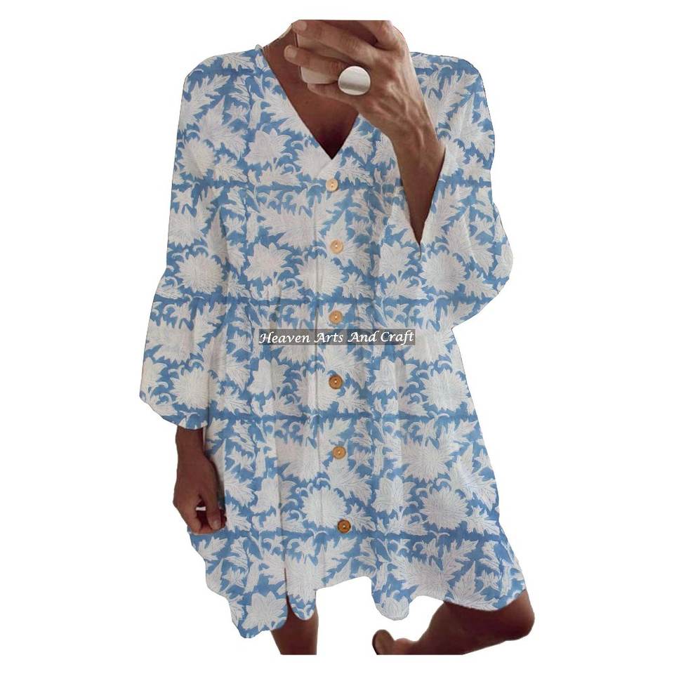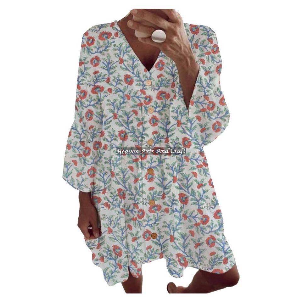เดรสผ้าฝ้ายพิมพ์ลายโบฮีเมียน แขนทรงระฆัง เสื้อผู้หญิงน้ำหนักเบาสำหรับฤดูร้อน เสื้อเชิ้ตสไตล์ลำลอง แรงบันดาลใจจากฮิปปี้ โบโฮท็อป