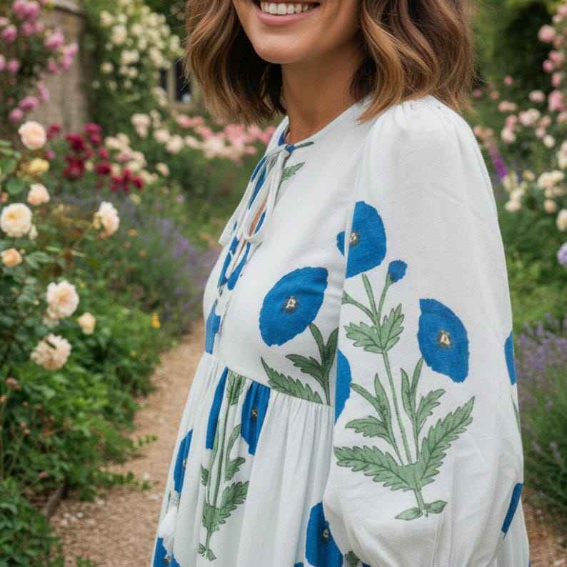 ชุดเดรสผ้าฝ้ายโบฮีเมียนลายดอกไม้พิมพ์ลายด้วยมือ ความยาวปานกลาง สวมใส่สบาย เหมาะสำหรับฤดูร้อน สำหรับผู้หญิง