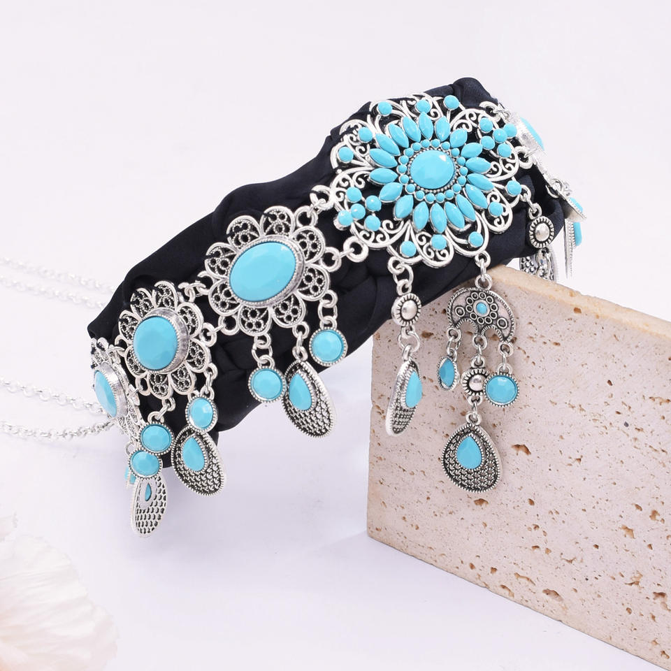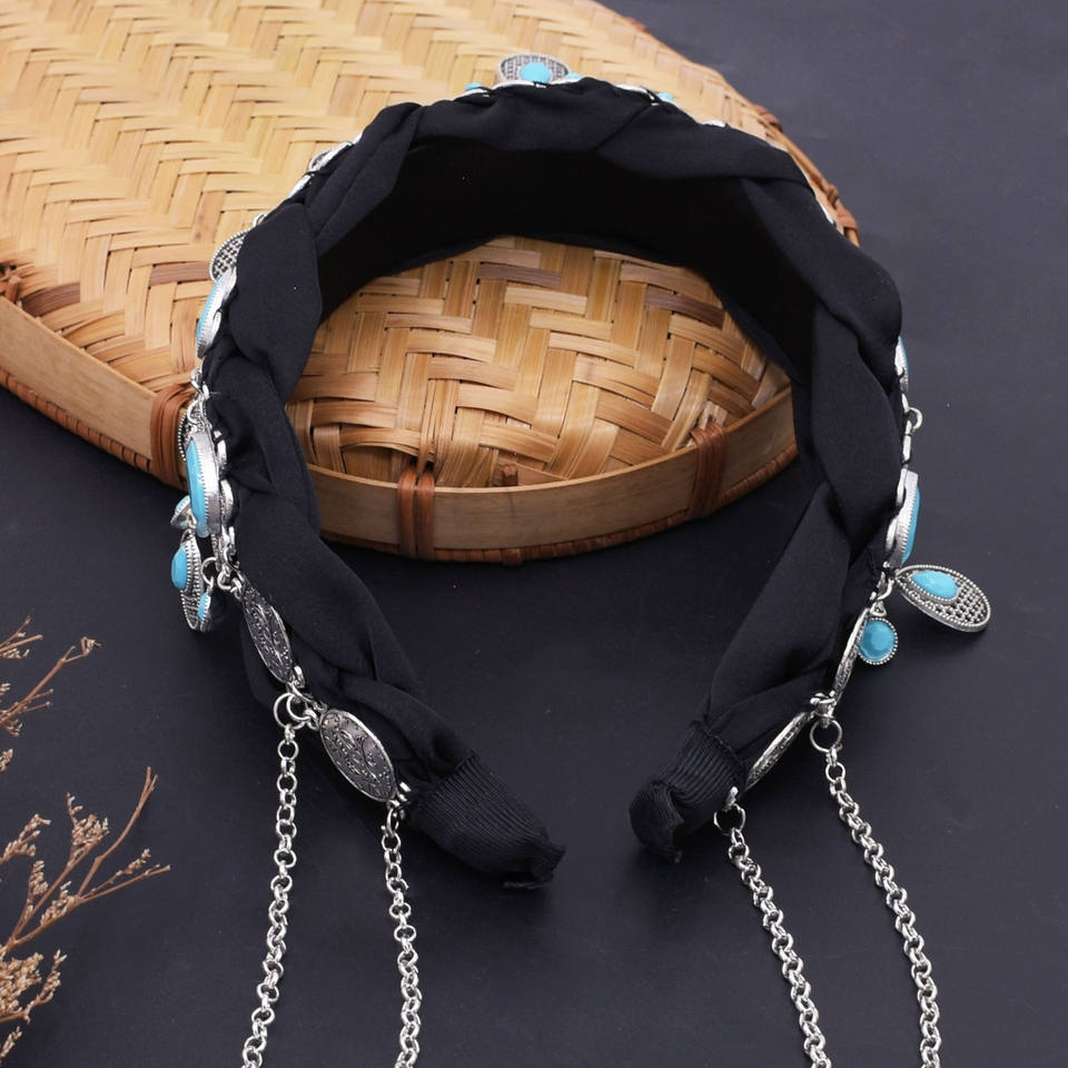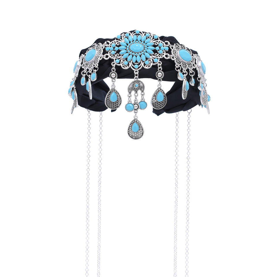 ที่คาดผมแบบโบฮีเมียนสไตล์เรโทรแบบชาวโบฮีเมียนจี้เทอร์ควอยซ์เทียมสำหรับงานเต้นรำสุดหรูเครื่องประดับผม