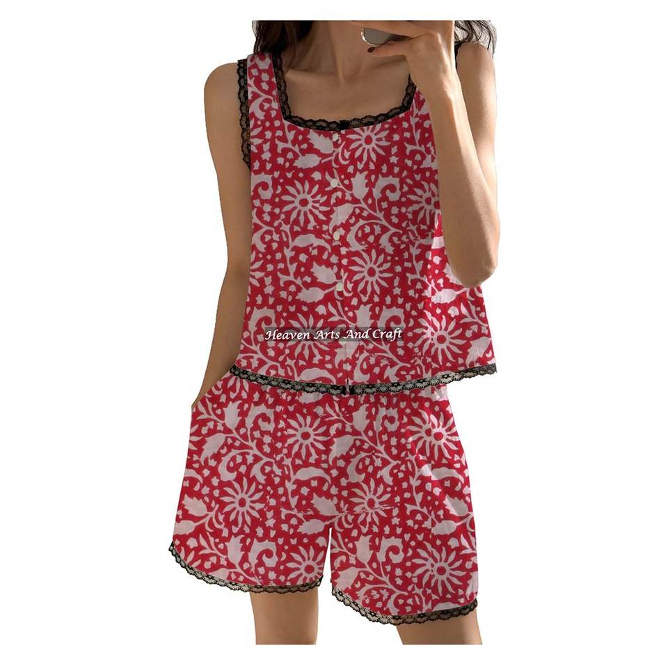 ชุดนอนเซ็ตสองชิ้นสไตล์โบฮีเมียน แต่งขอบลูกไม้ กางเกงขาสั้น ชุดนอนแฟชั่นสำหรับคนเมือง ลายดอกไม้ ฤดูใบไม้ผลิ/ฤดูร้อน ชุดนอนแขนกุด ลายพิมพ์บล็อก