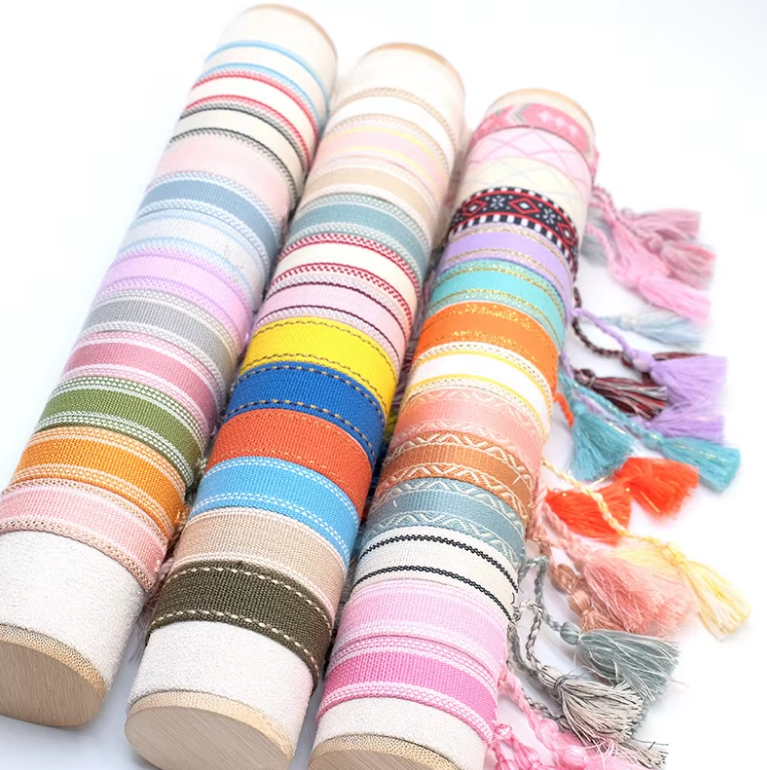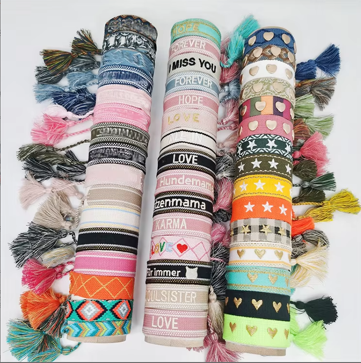 ของขวัญเทศกาลโบฮีเมียน กำไลข้อมือแบบพันชุบทอง 18K พร้อมพู่ปักตัวอักษรตามสั่ง ผ้าริบบิ้นทอ