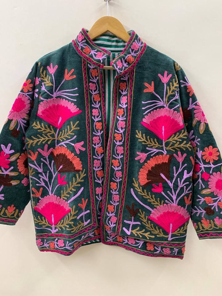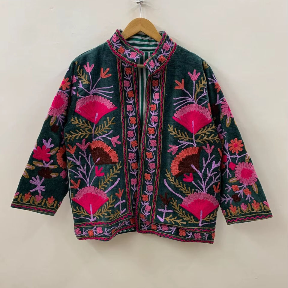 Suzani เสื้อแจ็คเก็ตผ้ากำมะหยี่ปักลายดอกไม้โบฮีเมียนเสื้อโค้ทตัวสั้นถักกันลมและระบายอากาศได้สำหรับฤดูหนาว
