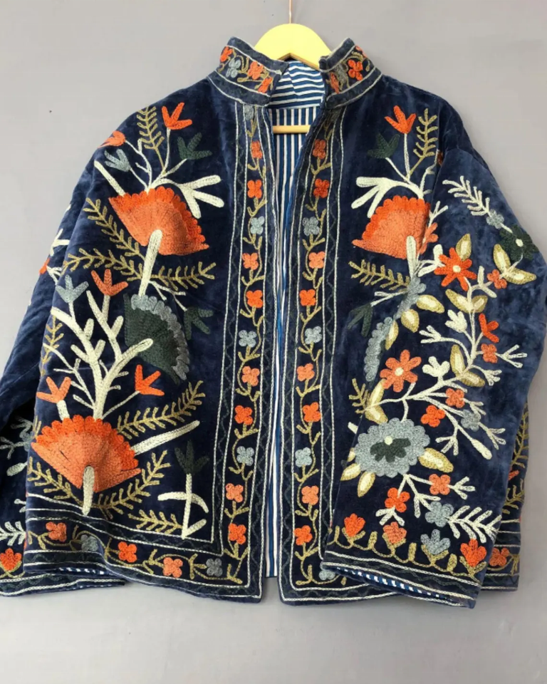 Suzani เสื้อแจ็คเก็ตผ้ากำมะหยี่ปักลายดอกไม้โบฮีเมียนเสื้อโค้ทตัวสั้นถักกันลมและระบายอากาศได้สำหรับฤดูหนาว