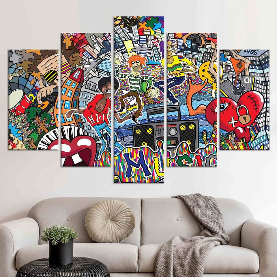ผ้าใบพิมพ์ลายกราฟฟิตีสไตล์โบฮีเมียน: ของตกแต่งผนังทันสมัยและมีศิลปะ ชุดผ้าใบพิมพ์ลาย 5 ชิ้น