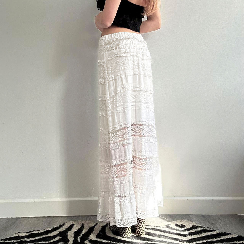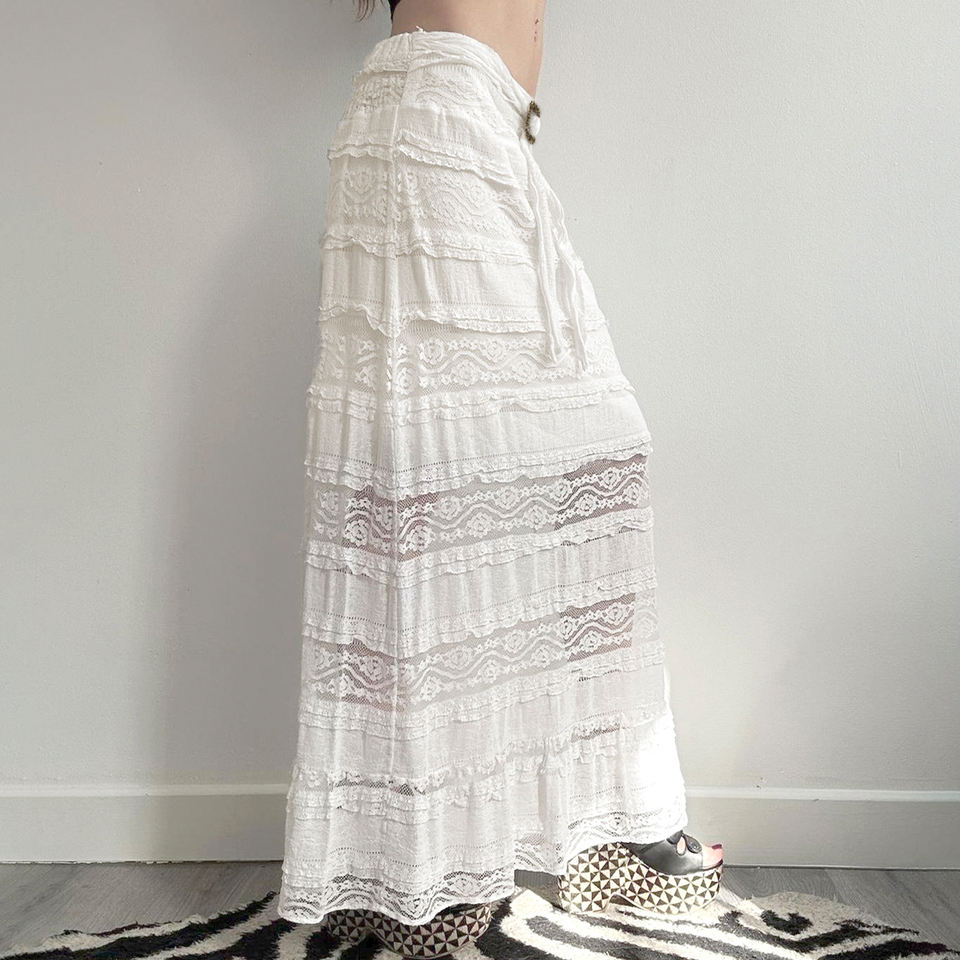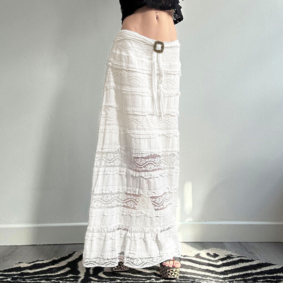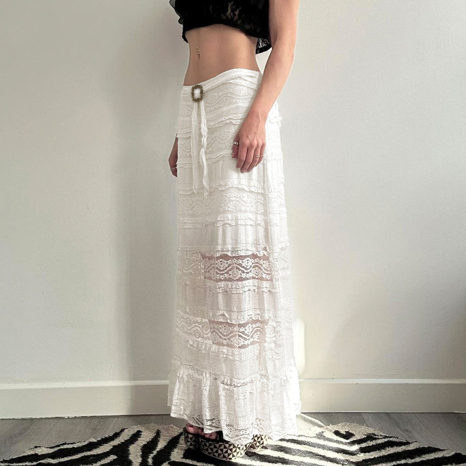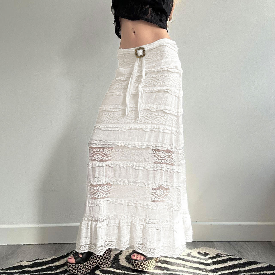 กระโปรงแม็กซี่ผ้าลูกไม้ปะติดปะต่อสไตล์โบฮีเมียนสำหรับวันหยุดพักผ่อน ตกแต่งด้วยกระดุมและผ้าตาข่ายเนื้อนุ่ม สีพื้น เรียบหรูสำหรับผู้หญิง