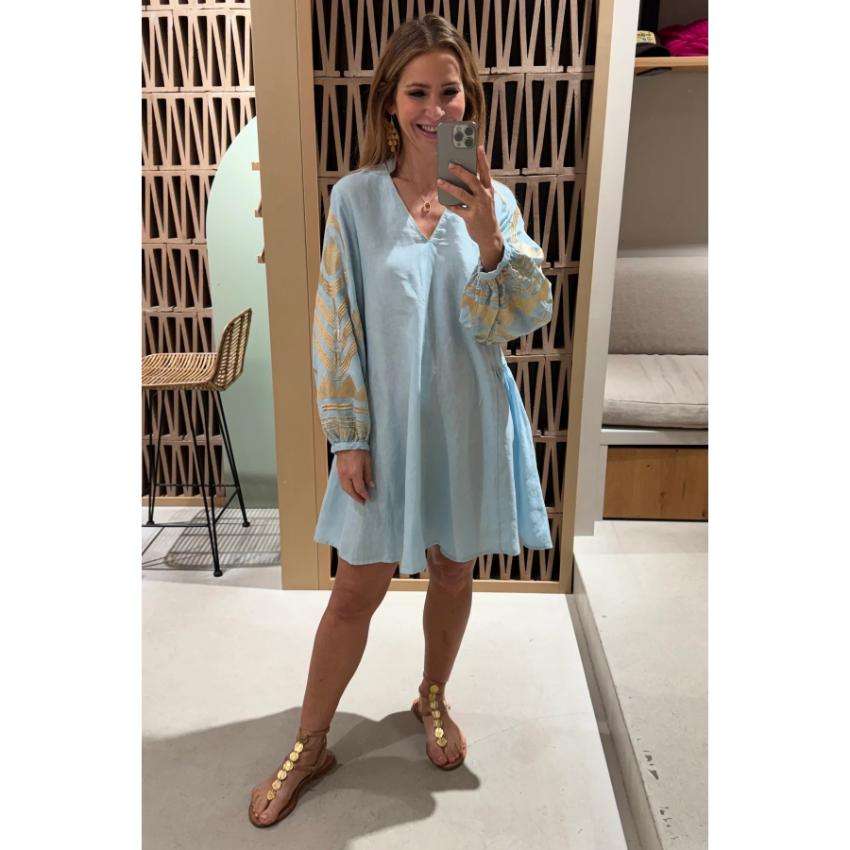 เดรสยาวทรงโบฮีเมียน คอวี แขนสามส่วน ปักลายดอกไม้ พิมพ์ลายดอกไม้ แต่งพู่ สีฟ้าอ่อน ผ้าฝ้าย 100% สำหรับฤดูร้อนและชายหาด