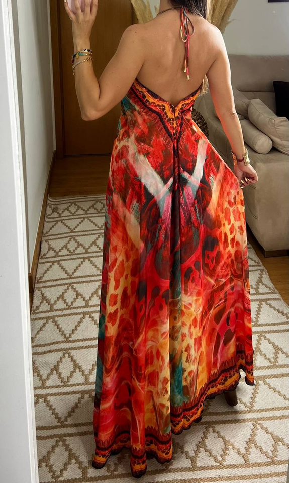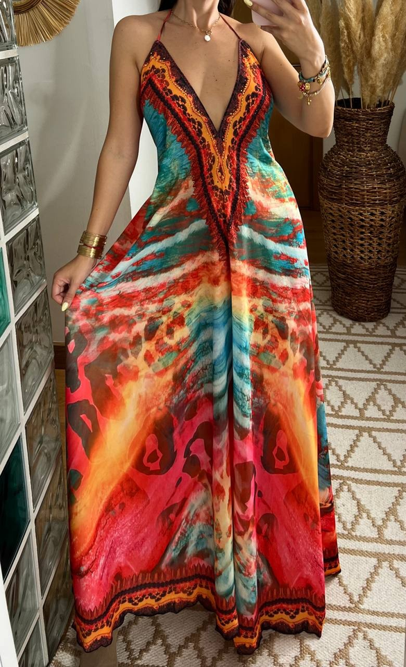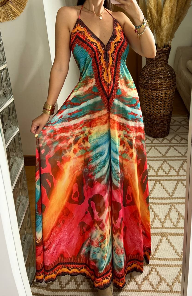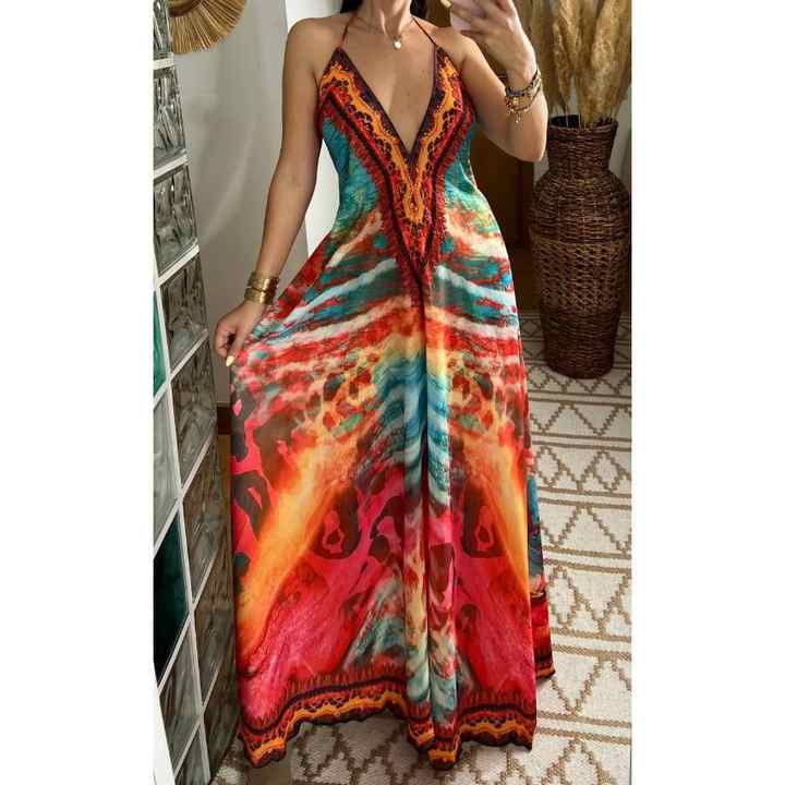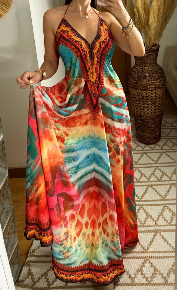 Bohemian Multicolor Eco-Friendly Casual Maxi Dress Deep V-Neck Halter Backless Design Natural Waist Abstract Animal Print for